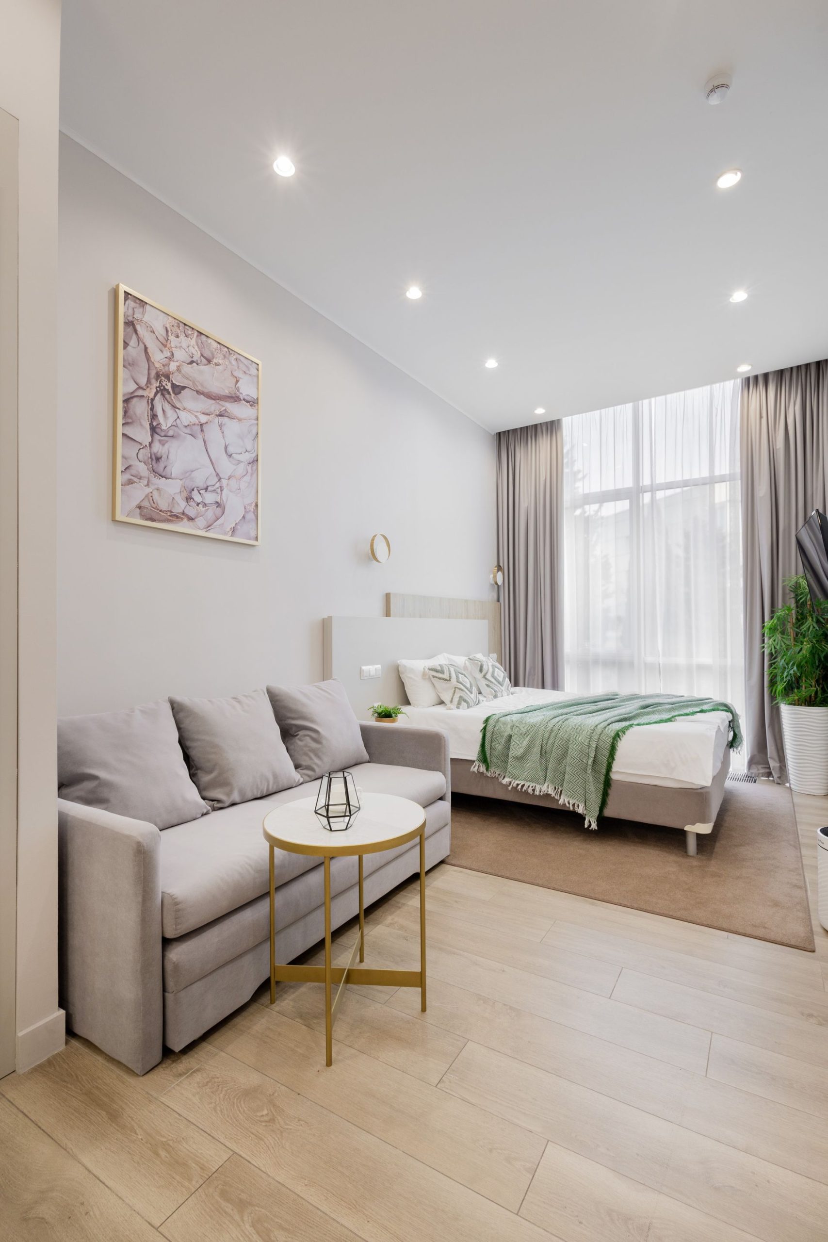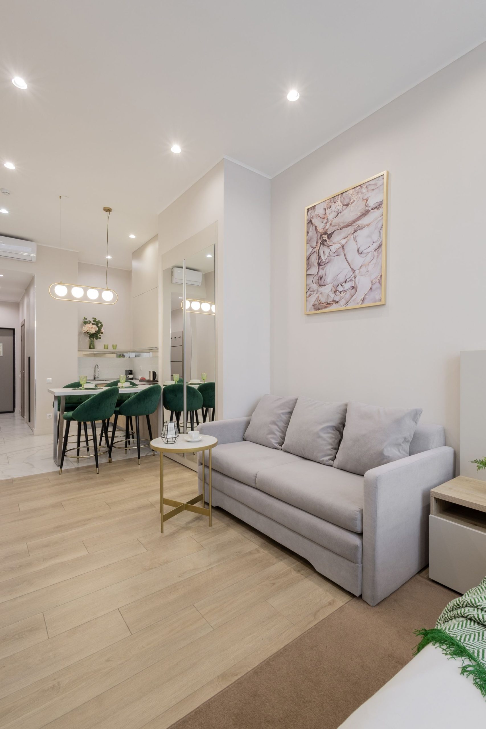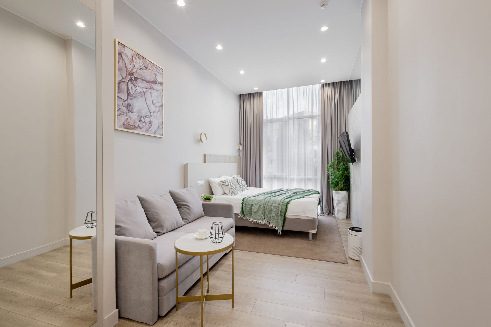В апартаментах удобная двуспальная кровать а также, есть раскладной диван, как дополнительное место. Имеется всегда чистое и свежее постельное белье, мягкие махровые халаты и полотенца. Для любителей готовить есть оборудованная кухня с необходимой посудой и принадлежностями. Также, есть телевизор и WiFi.