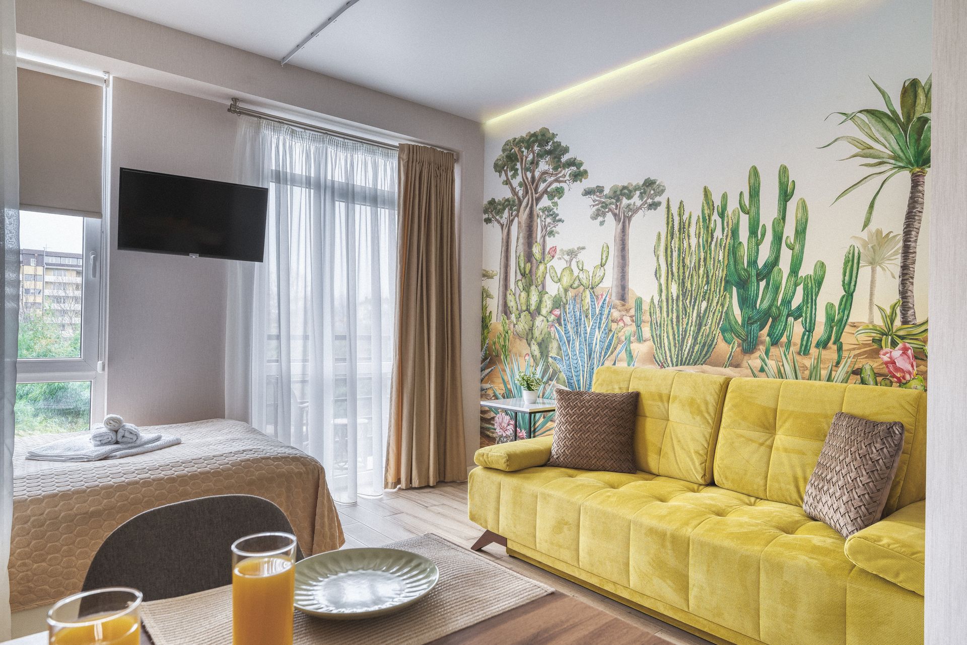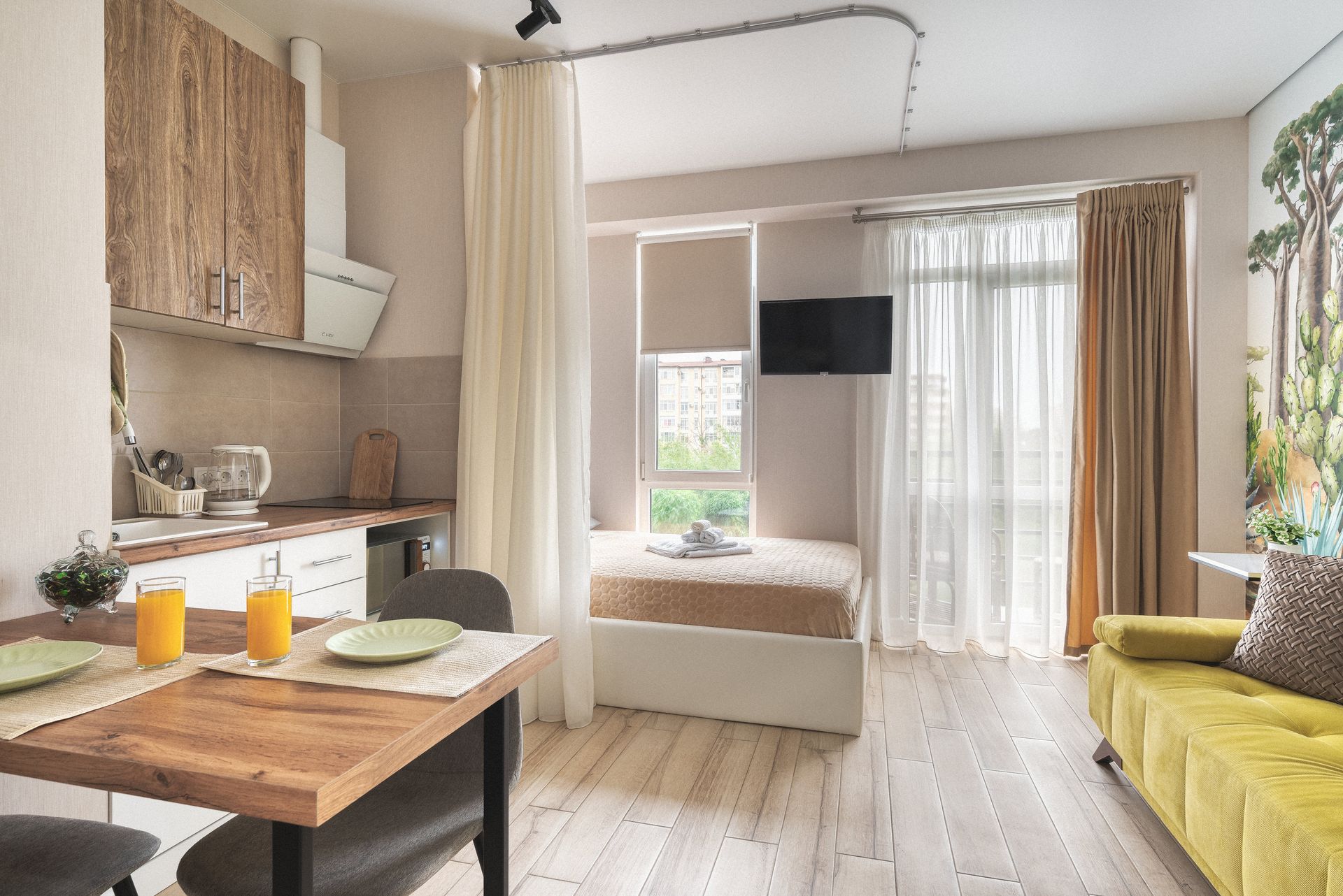 Очень уютная, светлая и стильная квартира, с дизайнерским ремонтом. С балкона открывается живописный вид на бамбуковую рощу. Все что нужно для комфортного проживания имеется: тапочки, полотенца, предметы личной гигиены, постельное белье, посуда, бокалы, приборы, гладильная доска, утюг, фен, чай, кофе) А также, удобная кровать с ортопедическим матрасом, уютный диван-кровать. И, конечно, шикарный вид с балкона или панорамного окна на бамбуковую рощу. Ни один волшебный закат не пройдёт мимо Вас) Во дворе есть детская площадка и парковка. Расположена в ЖК "Сорренто Парк" в 100 метрах от моря, в самом сердце Адлера. В пешей доступности ТРК "Мандарин", множество оборудованных пляжей, кафе, детских развлечений. В 10-ти минутах ходьбы Иммеритинка, Олимпийская набережная. В Сочи-парк, Олимпийский парк можно доехать на машине, либо прогуляться пешком.